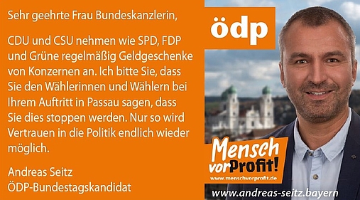 Am 18. September kommt Angela Merkel zu einem Wahlkampfauftritt nach Passau. ÖDP-Bundestagskandidat Andreas Seitz fordert von der Kanzlerin bei ihrem…