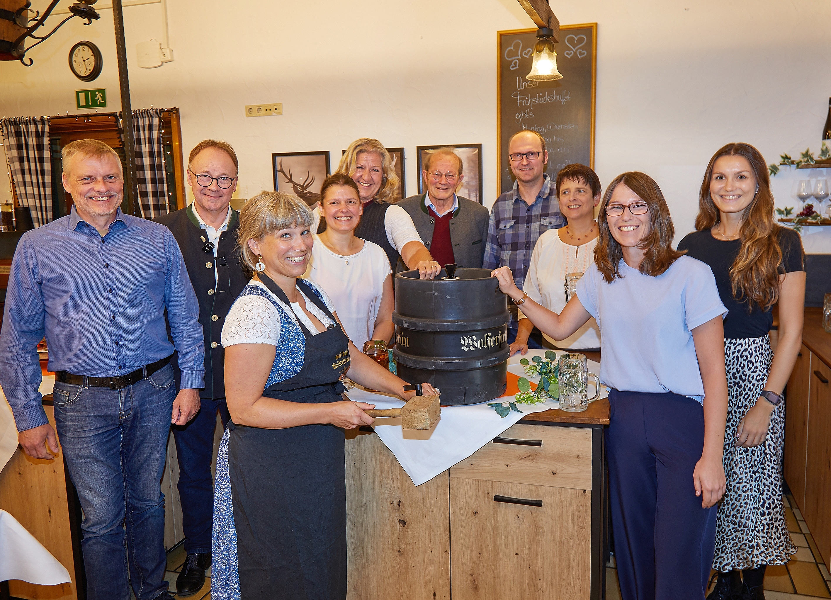 Sie feierten am Samstag „25 Jahre Streichung des AKW-standortes Pleinting“ im Gasthof Wolferstetter mit einem Fass Freibier (von links): die ÖDP Bezirksvorstandsmitglieder Jörn Rüther und Bezirksrat Urban Mangold, die designierte Vilshofener Bürgermeisterkandidatin Katharina Steininger, die bayerische ÖDP-Chefin Agnes Becker, Diane Mohrhauer von der ÖDP Vilshofen, Bündnis-Waldschutz-Sprecher Dr. Herbert Wurster, Simon Löwen, Kreisrätin Anita Hofbauer und Annika Zwerenz von der Vilshofener ÖDP sowie die stellvertretende niederbayerische ÖDP-Vorsitzende Johanna Seitz. Foto: Josef Lang.